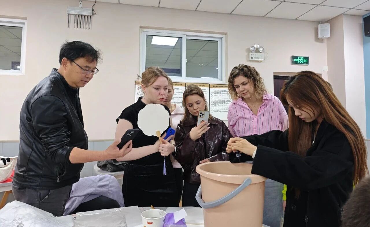 中国非遗体验漆扇制作——国画课后,在国际交流中心老师景圣淅的带领下,俄罗斯学子与我校设计与美术学院学子携手体验漆扇制作。在这个过程中,学子们体悟到三千年漆艺底蕴与中国传统手工艺的独特韵味。