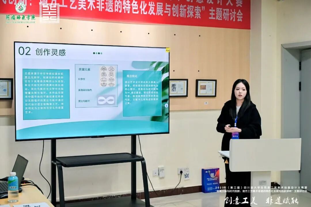 决赛期间,赛事同步举办非遗活态展示与体验活动、高校工艺美术优秀作品展,以及“地域文脉与时代创新:地方工艺美术非遗的特色化发展与探索”研讨会等环节,为参赛师生搭建了宝贵的学习交流平台。在高校工艺美术优秀作品展中,我院学子现场讲解自己的获奖作品,充分展现出深厚的专业素养与突出的创新能力。