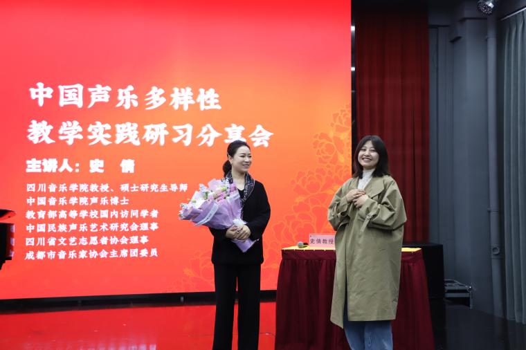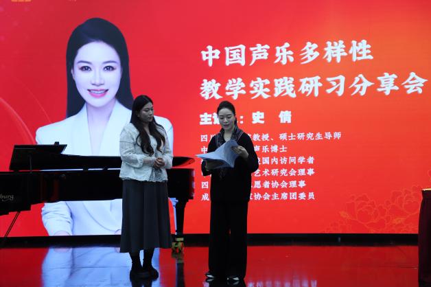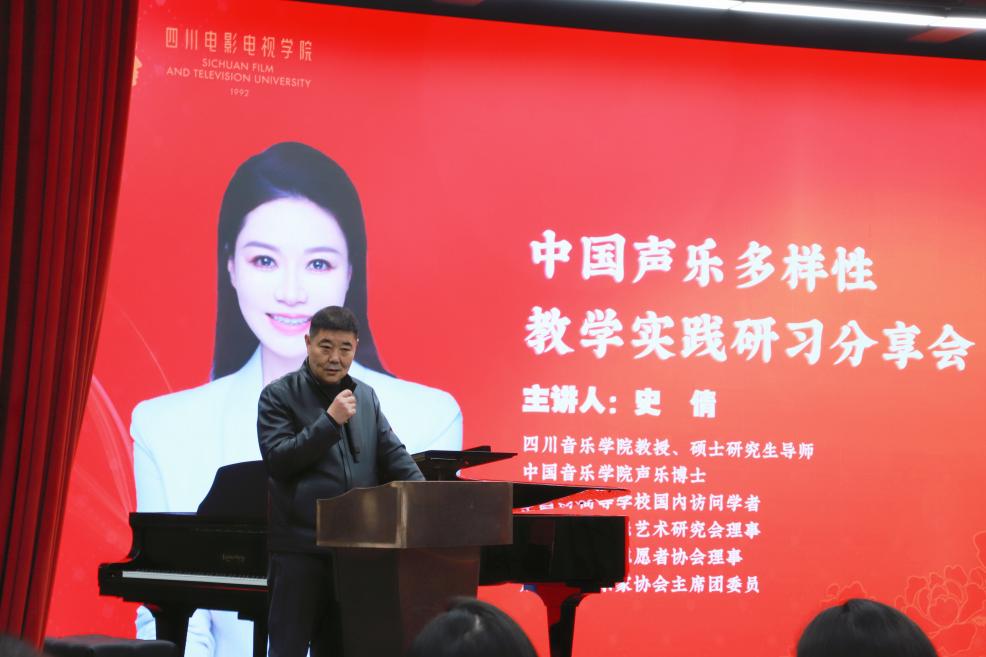 此次分享会由音乐学院李兵院长、黄娟副院长、党委副书记贺贝及全体教师和部分学生参加。分享会开始前,李兵院长上台发言,并对史倩教授的莅临致以热烈欢迎,李兵院长发言中强调中国声乐的多样性传承与教学创新对学院人才培养的重要意义,希望全体师生珍惜与行业名家面对面交流的机会,在研习中汲取养分、精进专业;围绕学院声乐教学的实践探索与未来规划展开分享,表达了搭建高水平交流平台、助力师生专业成长的坚定决心,为整场分享会奠定了务实而热烈的基调。