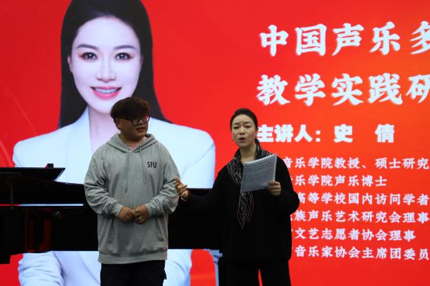 在实践研习环节,首先史倩教授带来了她的两名研究生,并且展示了她的教学方式,其次史倩教授现场聆听了音乐学院几位同学的演唱,并进行了细致入微的指导。她从咬字吐字、气息支撑、共鸣运用、作品时代背景与人物性格分析等多个维度,对同学们的演唱进行了精准的“把脉”与“诊断”,并亲自示范,展示了科学发声方法与丰富艺术表现力的完美结合,并对我院学生的演唱给予了肯定。史教授生动形象、妙语连珠的讲解,以及极具启发性的教学方式,赢得了在场师生的阵阵掌声。